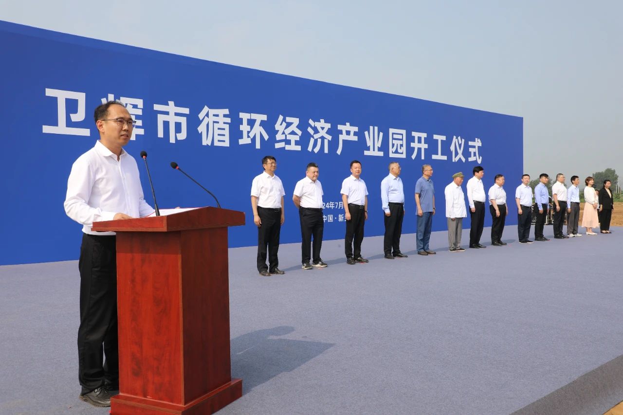 儀式第二項,新鄉市委常委、統戰部部長、市政府黨組成員祁文華講話。他說,我們在這里隆重舉行衛輝市循環經濟產業園開工儀式,既是深入貫徹習近平生態文明思想,大力發展循環經濟,推動綠色低碳高質量發展的生動實踐,也是堅持以科技創新引領產業創新,積極培育和發展新質生產力的重要舉措,對進一步優化全市產業結構、實現經濟高質量發展具有重要意義。他指出綠色循環低碳發展,是當今時代科技革命和產業變革的方向,是新發展理念的重要內容。近年來,新鄉始終遵循減量化、再利用、資源化的循環經濟理念,大力發展循環經濟,推進資源節約集約利用,積極構建資源循環型產業體系和廢舊物資循環利用體系。今天開工建設的衛輝市循環經濟產業園,既是加快循環經濟技術成果轉化的重要載體,也是推進資源節約集約利用的重要嘗試,能夠實現聚酯塑料及下游應用全產業鏈閉合,達到聚酯塑料的無限循環,對提升我市包裝材料產業核心競爭力,推動產業鏈延鏈、補鏈、強鏈意義重大,必將為促進塑料行業綠色發展,實現碳達峰、碳中和作出積極貢獻。今天的項目就是明天的發展。他對衛輝市循環經濟產業園建設充滿期待。