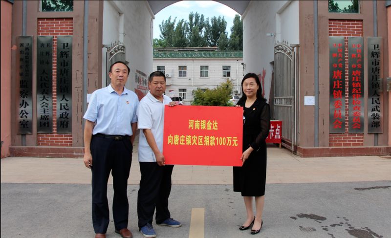 黨委書記、董事長(zhǎng)閆銀鳳代表河南銀金達(dá)集團(tuán)向唐莊鎮(zhèn)人民政府捐資100萬(wàn)元;